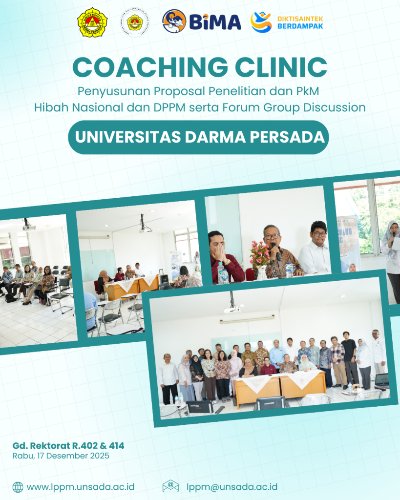 LPPM Universitas Darma Persada menyelenggarakan kegiatan Coaching Clinic Penyusunan Proposal Penelitian dan Pengabdian kepada Masyarakat (PkM) Hibah Nasional & DPPM 2026 yang dirangkaikan dengan Forum Group Discussion (FGD) pada hari Rabu, 17 Desember 2025 yang bertempat di R,402 & R.414 Gedung Rektorat Unversitas Darma Persada. Kegiatan ini diikuti oleh 47 dosen dari berbagai program studi di lingkungan Universitas Darma Persada.